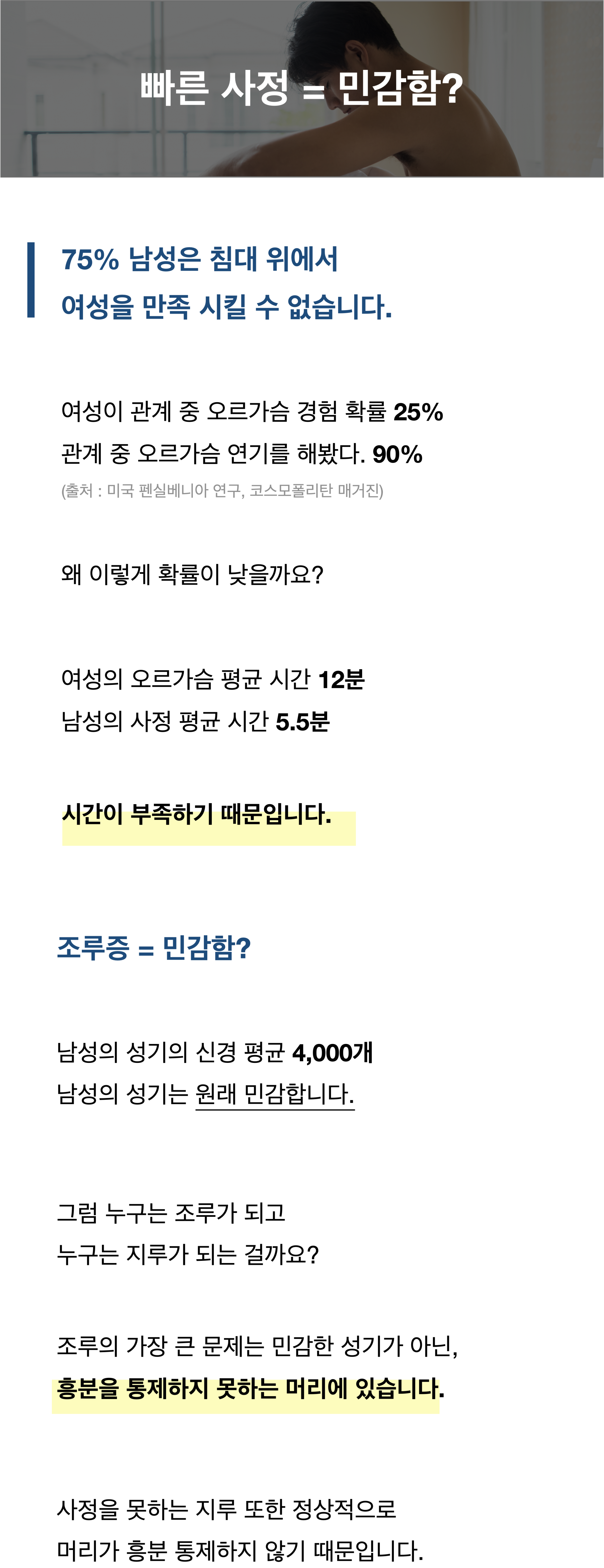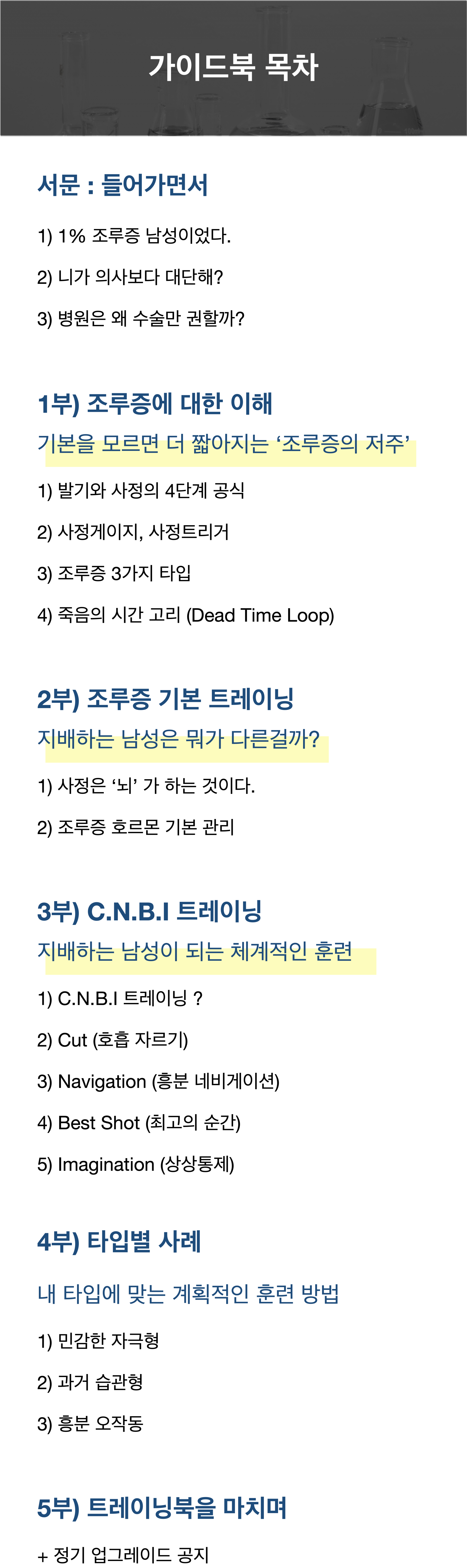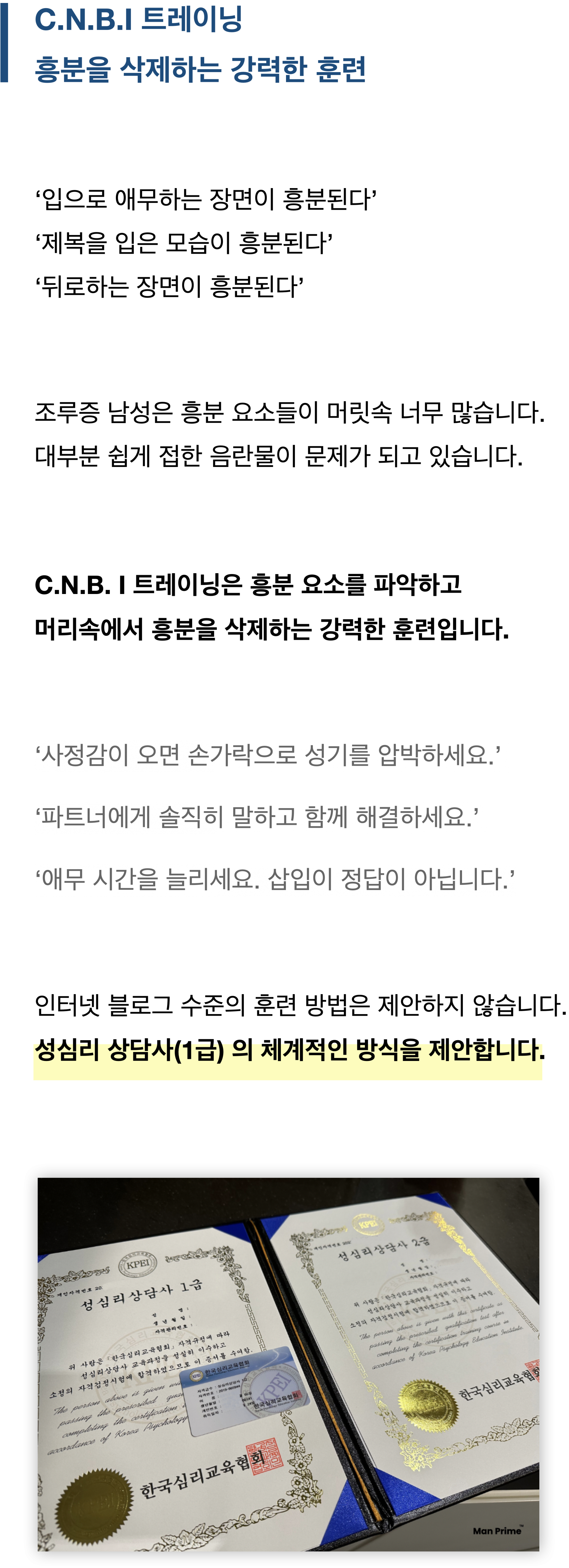 상위 1% 조루증 남성의 이야기 이 글을 읽고 있는 남성이라면 나처럼 99% 섹스 중 구라를 쳤을 것이다. ‘네가 너무 매력이 있어서 빨리 쌌다.’, ‘조임이 강해서 못 참겠다’, ‘피곤해서 빨리 쌌다’ 등 온갖 연기를 했을 것이 뻔하다. 그리고 인터넷에서 주워온 애무법으로 파트너가 만족했을 것이라고 자신을 속였을 것이다. 정신 차려라. 우리를 위한 연기다. 혹시나 이 글을 읽고 있는 당신의 자존심을 건드렸다면 부끄러워 하지 마라. 나는 당신 보다 심각한 1% 조루증 남성이었다. 콘돔을 착용하는 와중에 사정을 해본 적도 있다. 심지어 파트너와 키스를 하던 도중에 청바지에 눌린 자극 때문에 사정을 해버린 적도 있다. 정말 극심한 조루증 남성이었다. 갈수록 빠른 사정 시간에 불안함은 더 커졌다. 이번에는 무슨 핑계를 돼야 할까? 라며 머릿속이 복잡했다. 결국, 복잡한 머릿속 때문에 발기까지 되지 않는 상황이 왔다. 정말 죽고 싶을 만큼 고통스러웠다. 이를 해결해 보고자 인터넷을 돌아다니며 말도 안 되는 방법으로 조루증을 해결해보려고 했다. 귀두에 치약 바르기, 콘돔 두 개 사용해보기, 샤워 타월 둔감하게 해보기 등.. 정말 말도 안 되는 방법인 걸 알면서도 간절한 마음에 모두 시도했다. 물론 그 어떠한 것도 해결할 수 없었다. 행복해야할 성관계가 조루증 때문에 심각한 스트레스가 됐다. 그리고 더 내버려둘 수 없다고 판단했다. 수술적인 치료를 권하는 글이 많아서 내심 수술도 알아봤고 시술도 알아봤다. 하지만 수술을 권하는 글이 많은 만큼 부작용 사례도 많다. ‘신경통이 계속 있다’, ‘몇 달 후 다시 사정이 빨라졌다.’, ‘전혀 변화가 없다.’, ‘발기가 안 된다’ 라는 후기가 많이 있었다. 현재도 N사의 지식 검색을 들어가서 조루증 수술 부작용을 검색하면 정말 많이 나온다. 남성으로써 신체에서 가장 중요한 부위를, 부작용이 있는 수술대에 맡기는 것은 두려움 그 자체였다. 부작용 두려움뿐만 아니라 비싼 가격과 병원을 가는 부끄러움까지 생각하니 더욱 수술은 힘들었다. 다른 방법을 찾기 위해 인터넷보다는 신뢰도가 높은 조루증 관련 논문과 서적을 찾아보기 시작했다. 전문적인 자료를 찾아보니 조루증을 해결할 수 있는 훈련들이 있다는 걸 알았다. 하지만, 자료의 양이 많고 단어 하나 하나가 복잡했다. 그리고 그 누구도 조루증 훈련을 체계적인 방식으로 제안하지 않았다. 그래서 내가 직접 연구하고 훈련했다. 또한 나와 같은 조루증 남성들을 도와주며 정보를 쌓아 갔다. 본격적인 공부를 위해 성심리상담사 자격증 1급을 취득했다. 그리고 1~4단계의 체계적인 프로그램 C.N.B.I 트레이닝을 만들었다. 현재는 애무 시간을 포함하면 1회 관계 시 평균 40~50분 이상 섹스 시간을 가진다. 그리고 절정의 순간 파트너가 먼저 오르가슴을 느끼고 나면 몇 초 뒤 사정을 한다. 파트너와 타이밍이 잘 맞는 섹스가 끝나면 침대 위 파트너의 눈빛과 포옹의 진정성이 다르다. 사기라고 의심된다는 것을 잘 안다. 인터넷에서 본 온갖 허위 광고성 문구와 말도 안 되는 해결 방법이 더 의심을 만들었을 것이다. 그래서 방대한 양의 자료를 사이트에 무료로 풀어두었다. 자료를 읽으면서 사기가 아닌지 철저하게 의심해라, 의심할수록 조루증에 대해 잘 알게 될 것이다. 그리고 무료 자료만 의심하며 읽어도 섹스 시간이 최소 10분 이상은 가능해질 것이다. 꼭 읽어보길 바란다. |